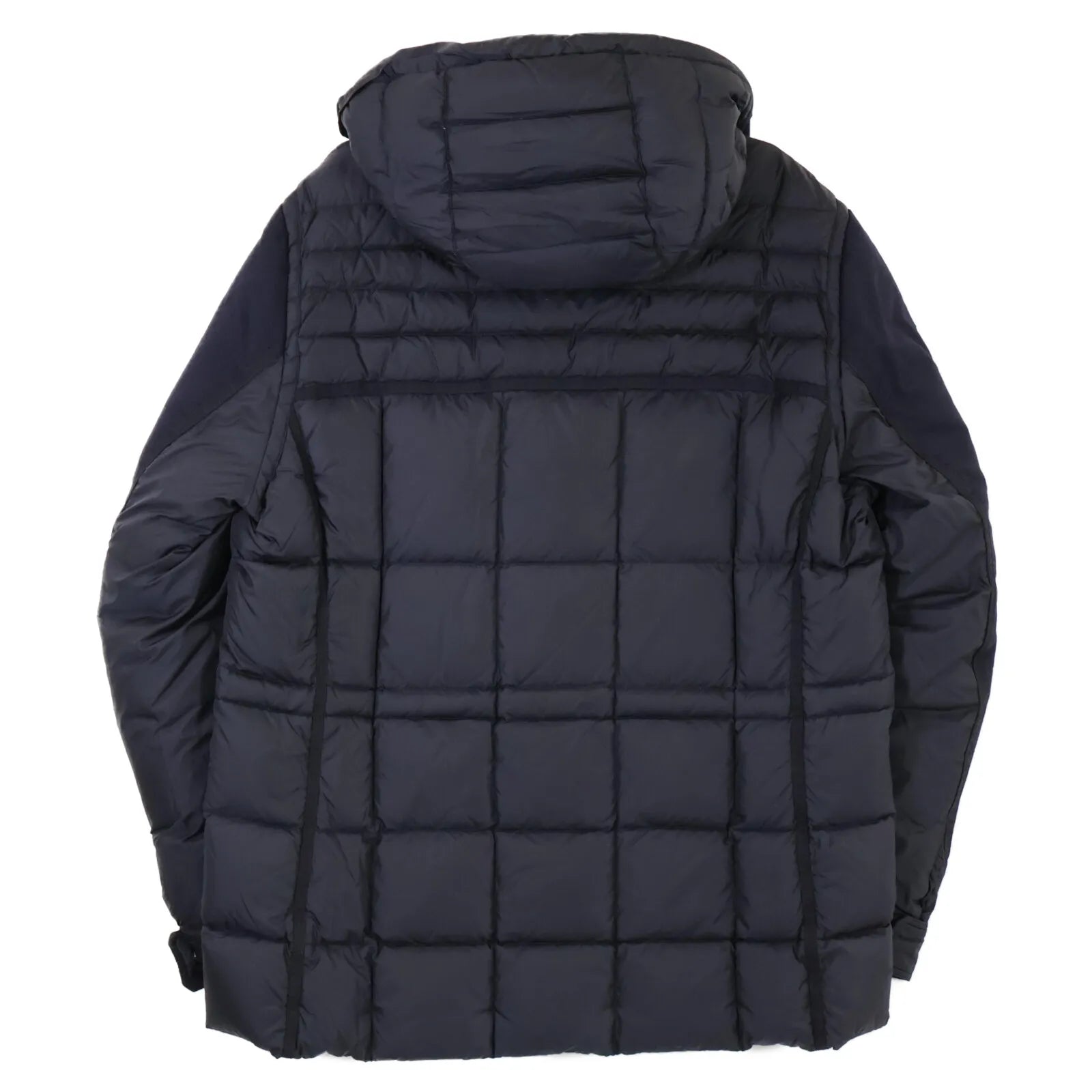Design: Quilted down body, chest flap pockets, zip + snap front, adjustable hood, sleeve patch